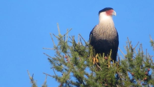 After an extensive journey to the northern Ontario wilderness and multiple days of surveying the trees near Foleyet, Chris Blomme and his birdwatching companions were preparing to return home to Sudbury. While inspecting the local dump, they were alerted by the sounds of several crows, indicating something unusual. Suddenly, a caracara appeared, flying over the area and perching in a conifer directly in front of them, presenting a remarkable sight.