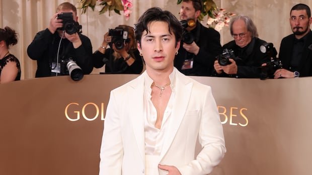 3. Hudson Williams, star of “Heated Rivalry,” donned an Armani ensemble featuring a cream dinner jacket, wide-leg trousers, a cummerbund, gold hoop earrings, and a Bulgari necklace.